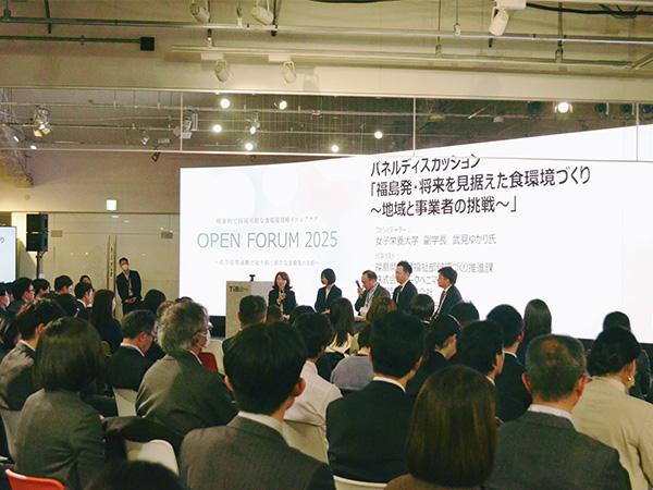 健康的で持続可能な食環境戦略イニシアチブでは、栄養・食生活の課題に関する世界的な動向と、本イニシアチブのこれまでの取組内容や、本イニシアチブが目指す社会像を広く伝え、健康的で持続可能な食環境づくりの一層の推進に向け、「オープンフォーラム2025 ~産学官等連携で切り拓く新たな食環境の共創~」を開催しました。パネルディスカッション「地域の未来を創る食環境モデル~”オールふくしま“での挑戦~」では、福島県で自治体と多様な事業者が連携した事例についてそれぞれの視点からお話をいただきました。 現地会場では参画事業者のブースでの取組紹介や、同じ目標を持って取組を進めている異業種の交流が活発に行われました。